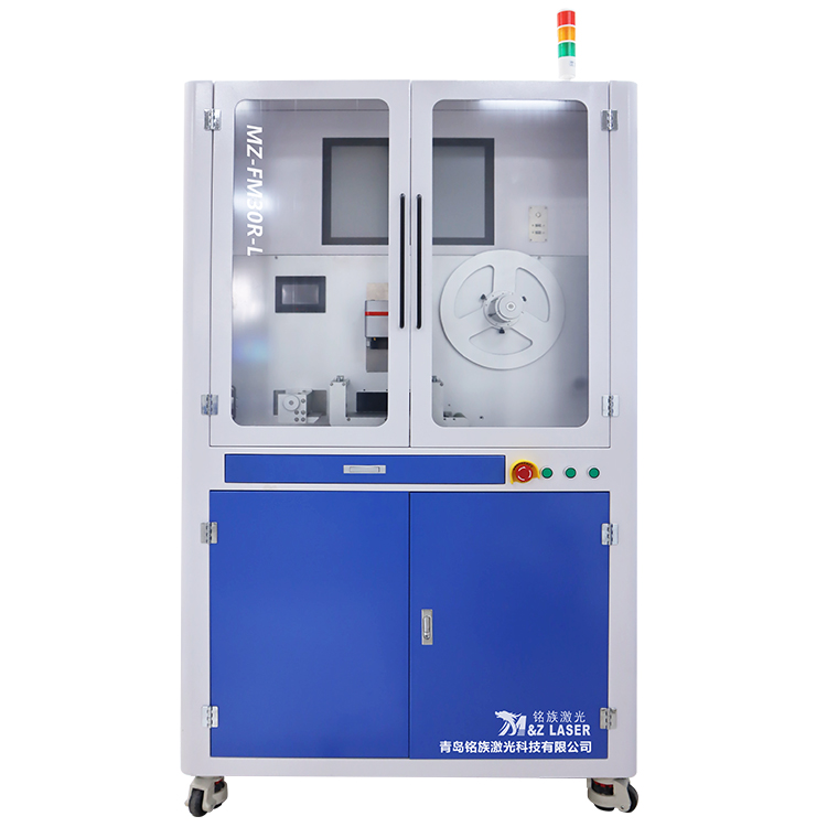 MZ-FM30-RL是一款全自動3M標簽激光打標機,其工作臺上安裝全自動放卷送料系統,人工將一卷標簽紙安裝好后并將整卷標簽紙送入導向板后壓緊,人工啟動打標開關,標簽紙自動走到打標位置真空吸附平整觸發激光打標,標簽紙打標完成,標簽紙運動到切紙位置,切紙機構壓緊標簽紙,自動切紙后退回到原位,切紙機構松開標簽紙,標簽紙掉落到接料盒收納,打標機進行下一張標簽紙打標循環,整卷紙根據人工或者MES系統給的